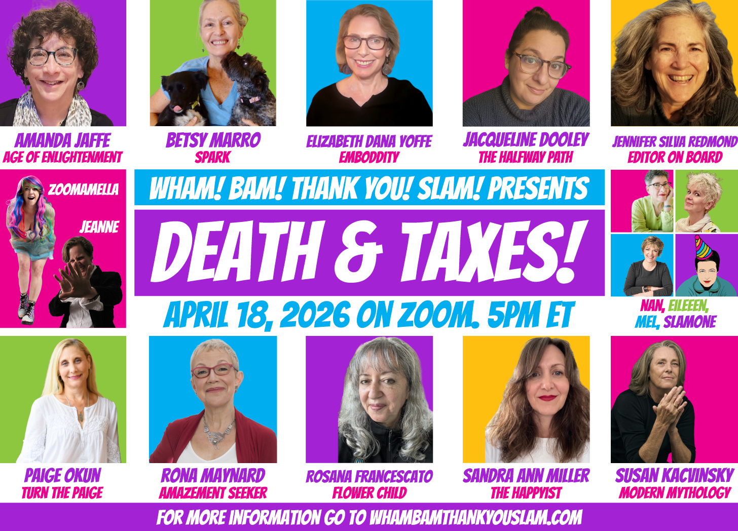 This theme this month is, no surprise, Death & Taxes. Ten feminist storytellers on one virtual stage. Come listen. Come watch. Come fight. Come tell your stories.