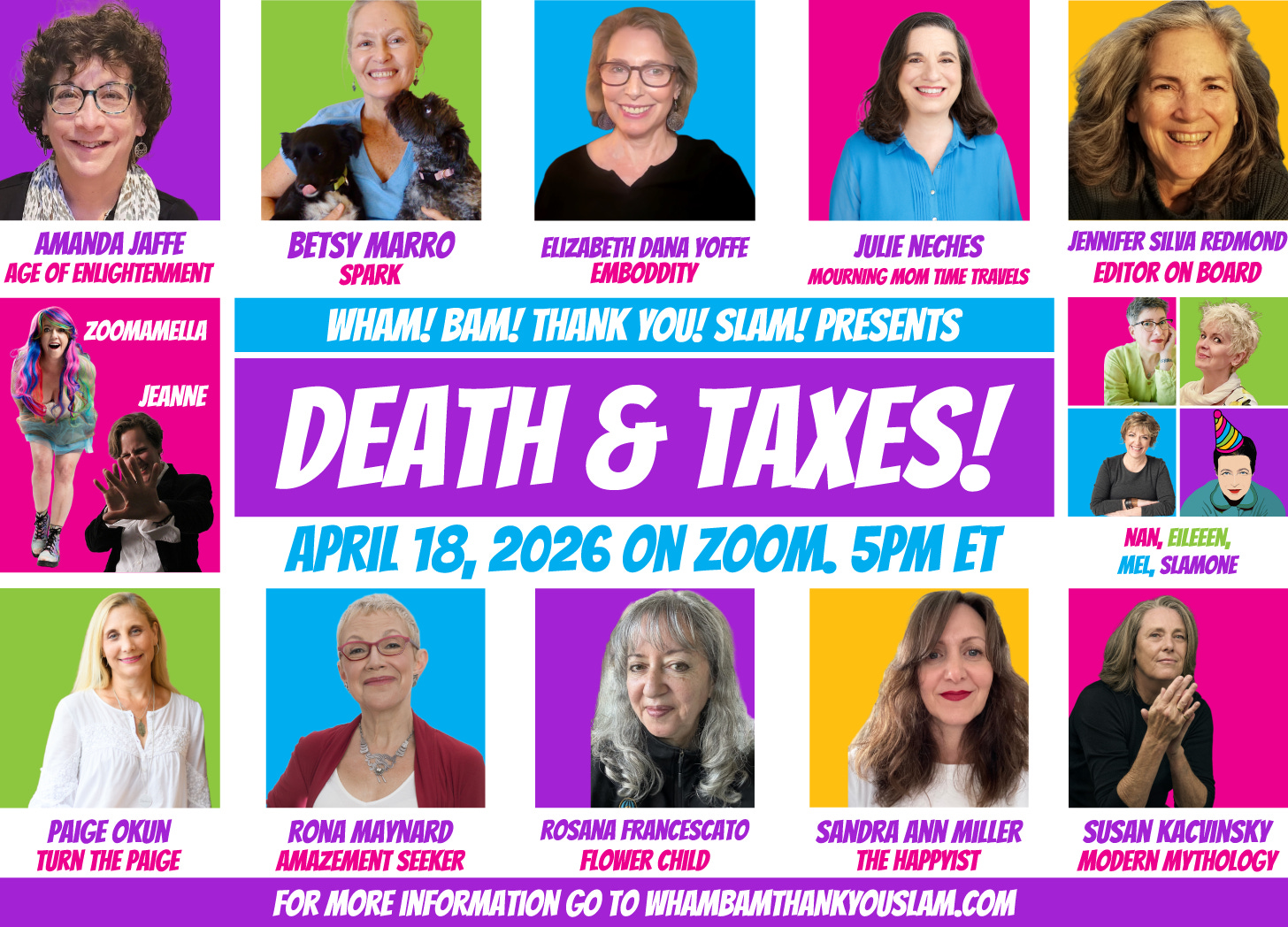 On April 18, 2026, at 5pm ET, Wham! Bam! Thank You! Slam! is back again, with Death & Taxes! If you haven’t been to one of my story slams, now’s a great time!