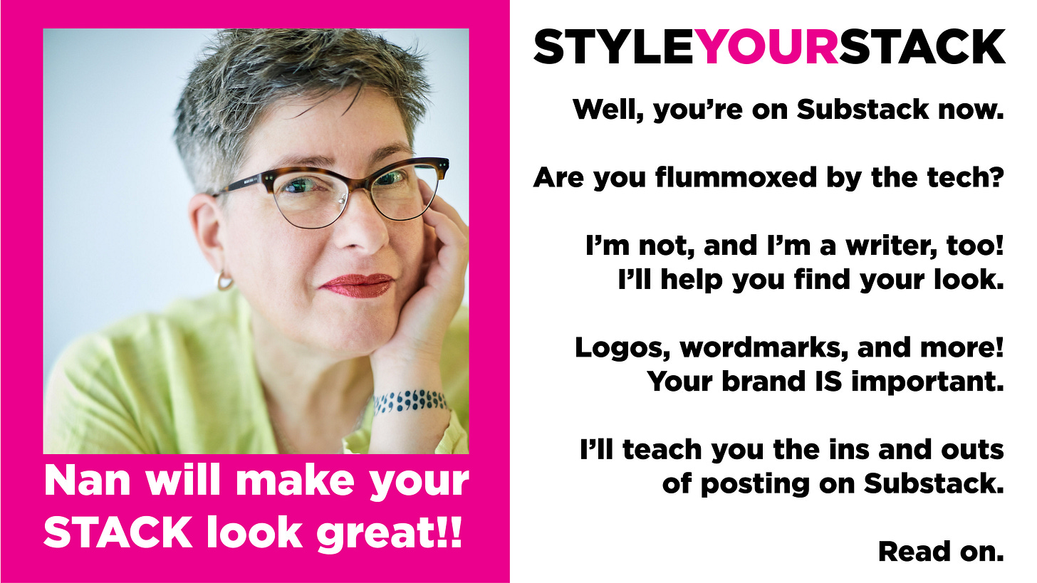 For those of you who don’t know, I’m also a graphic designer, and I’ve created a 2nd newsletter called StyleYourStack. I’m helping other Substack writers add logos, wordmarks, and welcome images so that they can market themselves more memorably and effectively. If you or anyone you know is writing on this platform and needs some help figuring out how all of it works, I’m here for that, too.