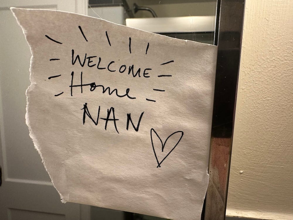 The note is scribbled in black marker on a scrap of paper torn from a larger piece. The paper is ragged. It makes me uncomfortable when things aren’t neat and tidy, but I put the feeling aside as I read the message. It’s simple. It says, “Welcome home, Nan,” and is adorned with a heart. I keep it there, because every time I see it, I smile.